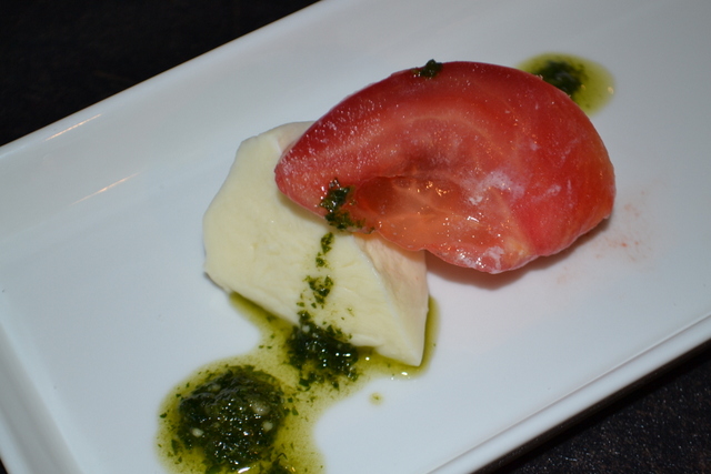 前菜の二品目は「金のモッツァレラとトマトのカプレーゼ 青じそジェノヴェーゼソース」