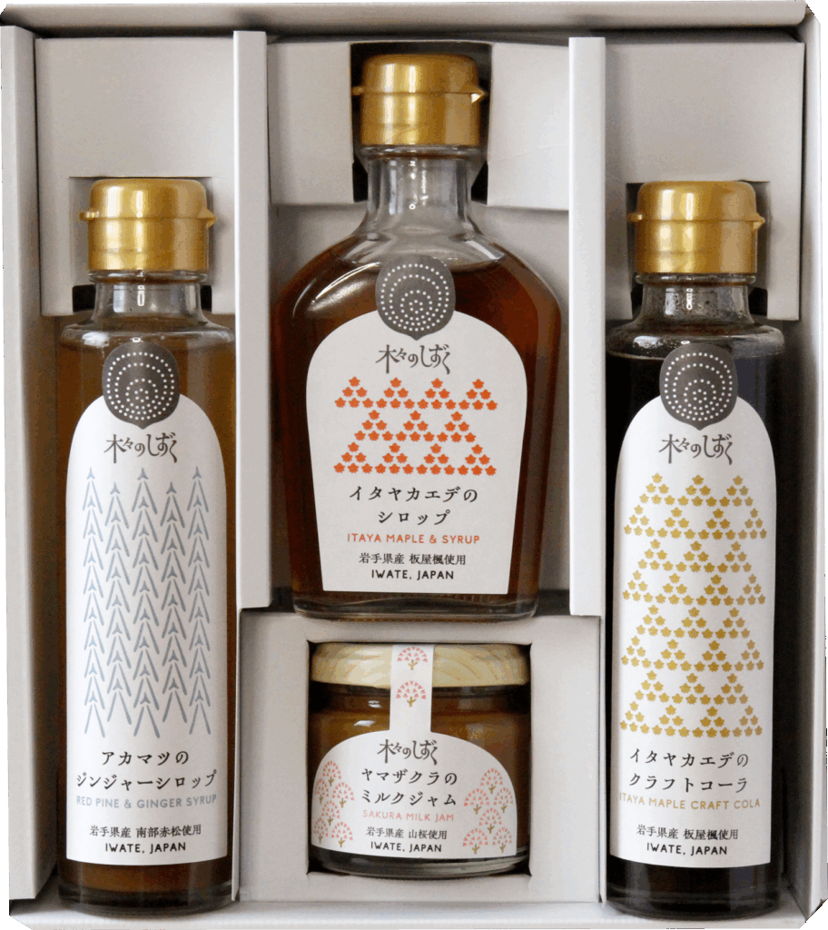 岩手の木々から抽出した天然の香りを活かした、クラフト感あふれる新シリーズ「木々のしずく」より、人気の4品をセレクト。ジンジャーエールやクラフトコーラ、シロップ、ジャムなど、自然の風味を楽しめる贅沢な詰め合わせです。大切な方への贈り物にもどうぞ。